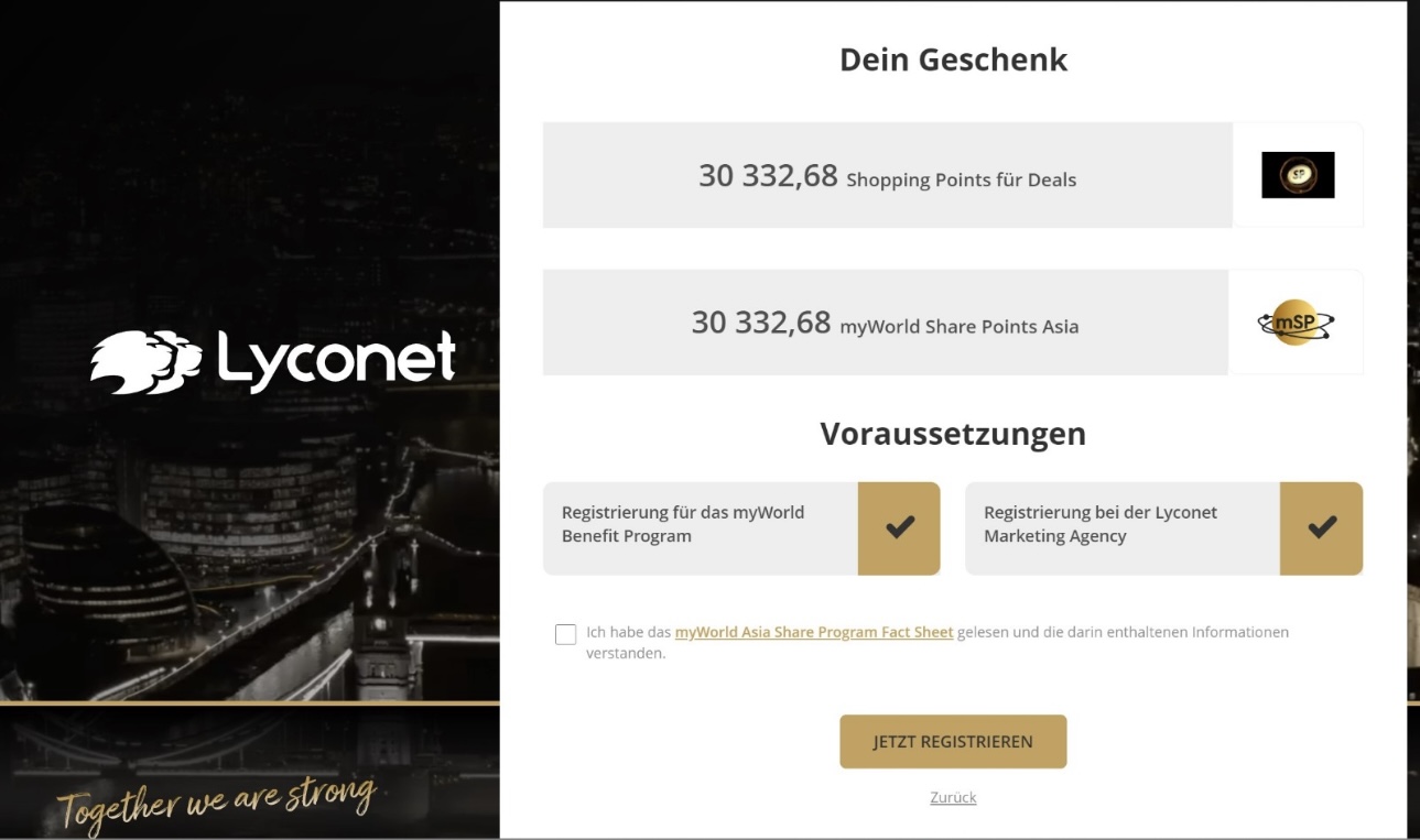 Dear Lyoness Member, due to the bankruptcy of Lyoness International AG and Lyoness Europe AG, we regret to inform you that you and your customers can no longer benefit from the myWorld advantages when shopping at myWorld and its partner companies. If you wish to continue enjoying the myWorld benefits and refer customers and partner companies, a re-registration with myWorld or Lyconet is required.
