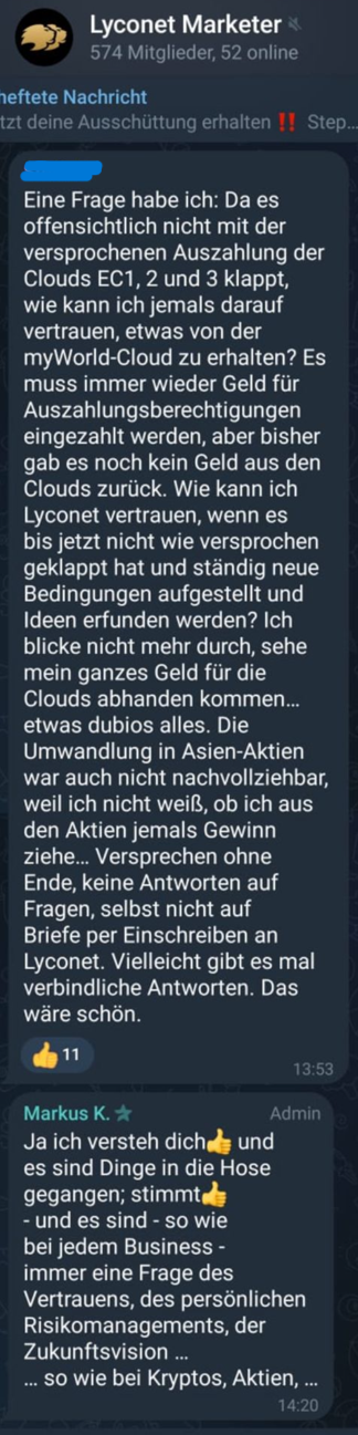 “I have a question: Since it’s obviously not working out with the promised payout of Clouds EC1, 2, and 3, how can I ever trust to receive anything from the myWorld Cloud? There’s always a need to deposit money for payout authorizations, but so far, there has been no money returned from the Clouds. How can I trust Lyconet when it hasn’t worked out as promised up to now, and new conditions and ideas are constantly being introduced? I can’t make sense of it anymore; I see all my money disappearing for the Clouds. It all seems somewhat dubious. The conversion into Asia stocks was also incomprehensible because I don’t know if I will ever profit from the stocks… Endless promises, no answers to questions, not even to letters sent by registered mail to Lyconet. Perhaps there could be some definitive answers at some point. That would be nice.
