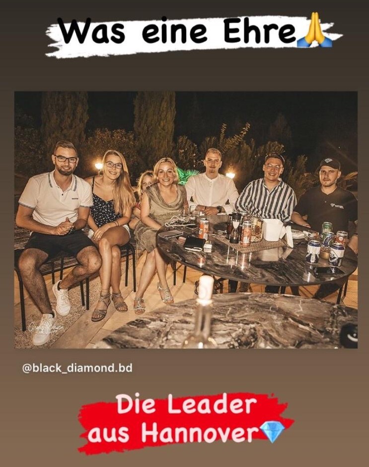 Despite all the presumed charity work, the TOP leaders are having a good time. The drilling of wells for drinking water and the planting of trees for the environment will have to be postponed when, for example, the no. 3 of “Black Diamond” Mrs. Marina Graf delights herself in her success in recruiting new paying members with pictures of the “Lyconet-BungaBunga yachts” or when the “Black Diamond-Leader” in Thessaloniki gets rewarded. (see pictures below)