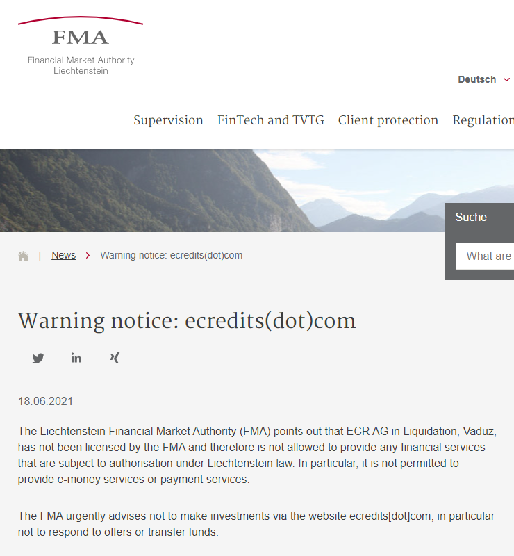 Financial Market Authority (FMA) Liechtenstein officially warns against “eCredits”!