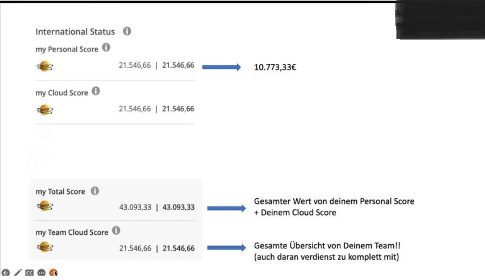 So how does the value come about? One would have to distinguish between MSP and shares, which are not the same value. In this chart, the marketer has a Personal Score of 21,546.66, and his share entitlement is half of these points in euros. Interesting how this calculation is done. In any case, one supposedly gets shares worth 10,773.33 euros. Whether that would be 40,000 or 3 shares, if the company ever goes public. Additionally, the total value of the company myWorld International AG is highly questionable.