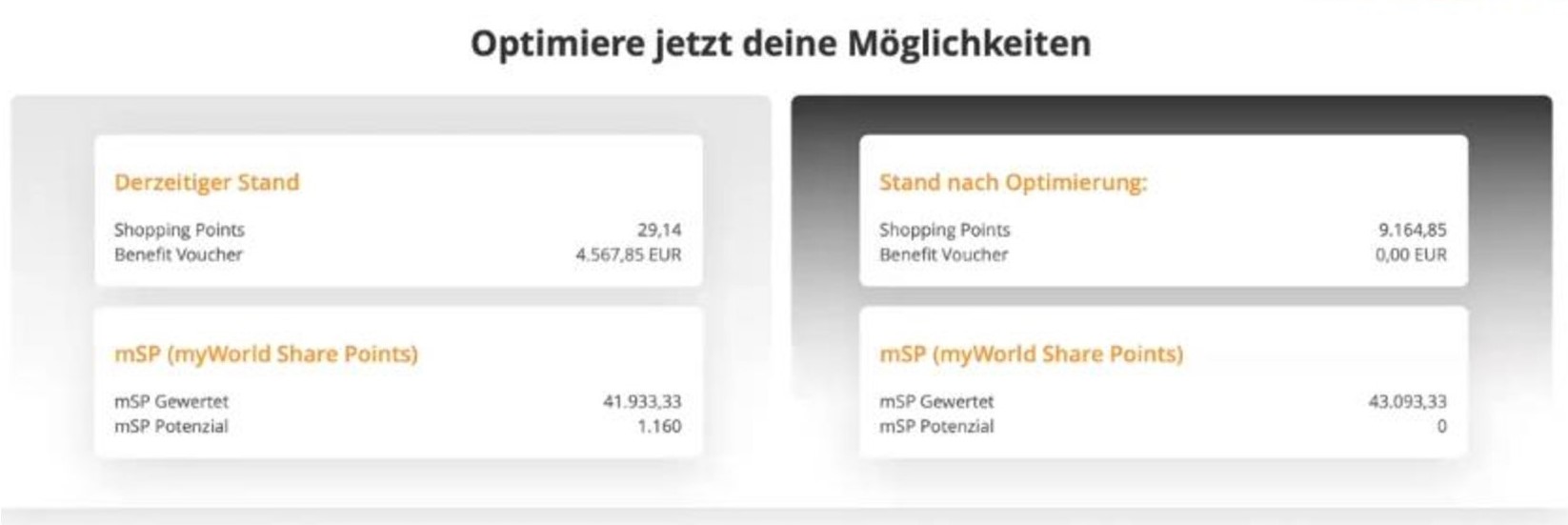 Now one is to accept so-called “optimizations” in the backoffice of the app. The accumulated Benefit Voucher Points are doubled and converted into Shopping Points. One Shopping Point suppsedly equals one Euro. She also claims that there are different ways to redeem your Shopping Points in actual cash. But if this were the case, every marketer who has been waiting for their money for years would do exactly that instead of spending money on a ticket while having to continue to have faith.