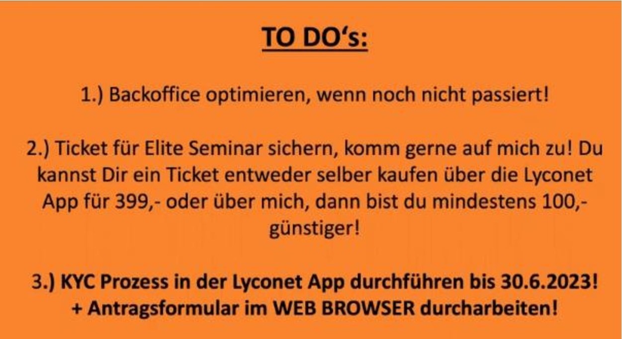 - Get a ticket for the Elite Seminar, don’t hesitate to contact me! You can either buy a ticket yourself via the Lyconet App for 399 Euro or you can buy it from me with at least 100 Euro discount!