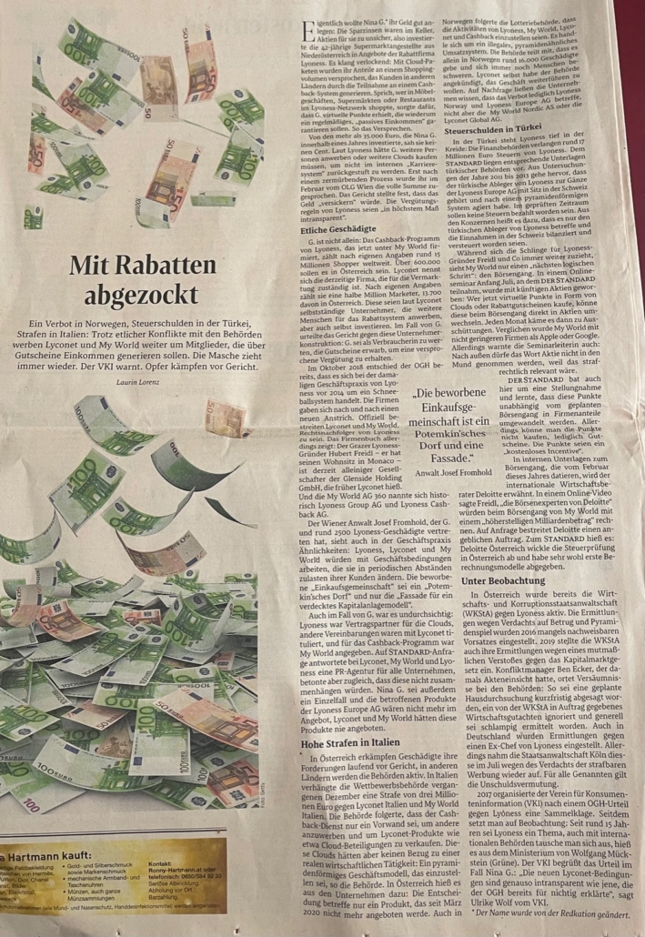 Viennese lawyer Josef Fromhold, who represented G. and around 2500 Lyoness victims, also sees similarities in business practices: Lyoness, Lyconet and My World would work with terms and conditions that they change at periodic intervals to the detriment of their customers. The advertised “shopping community” was a “Potemkin village” and only the “façade for a concealed capital investment model”.