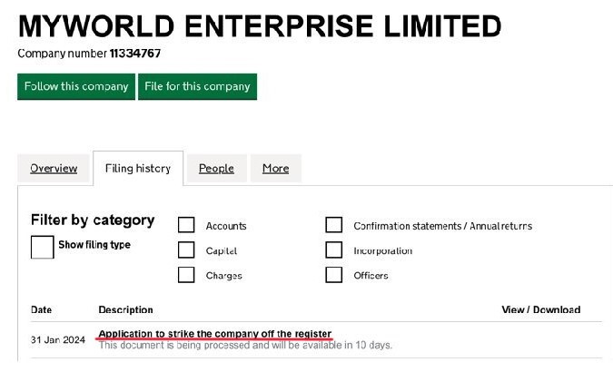 MyWorld dissolves MYWORLD ENTERPRISE LTD, registered in London, England. According to an insider, various funds have apparently been channeled through the company accounts of the GBP 100 company since 2018.