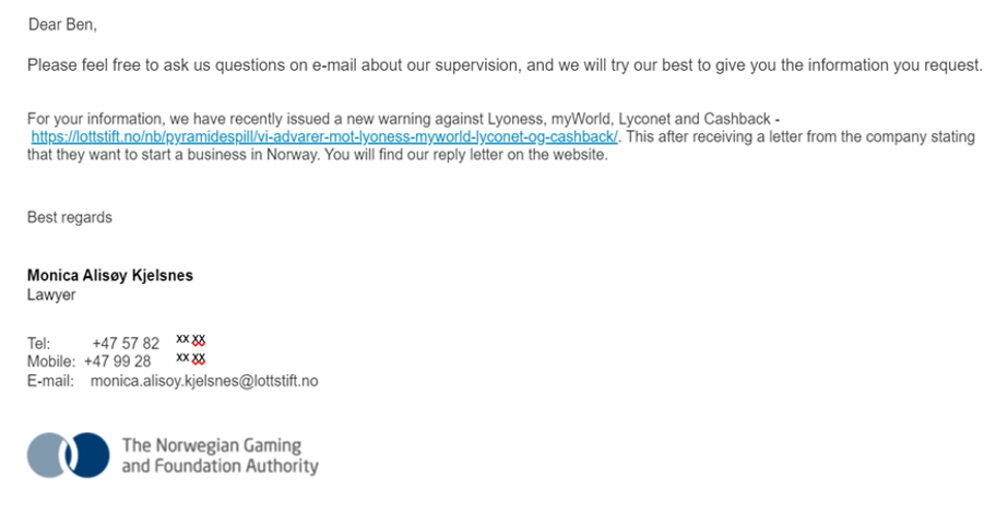 As Monica Alisøy Kjelsnes, a lawyer at the Norwegian Lotteries and Gaming Authority, told us on 17.03.2021, myWorld now wants to set up a company in Norway based on direct marketing. In the excerpt below of our email correspondence with Mrs. Kjelsnes, she sent us a link revealing myWorld’s alleged plans. According to myWorld, a renewed direct marketing concept would not involve any violation of laws in Norway.