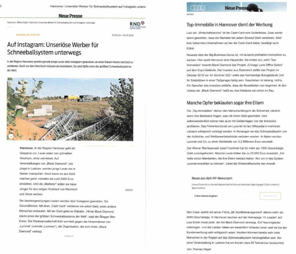The “New Press” from Hanover has also researched the snowball system at Lyconet and Black Diamond Cologne/Hanover and reported with an article about it: (Original can be read at the bottom) Here the translation: